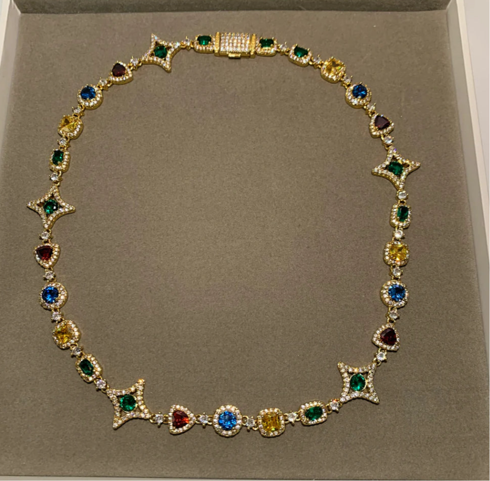 This colorful gemstone necklace features a variety of vibrant gems, adding a pop of color to any outfit. Crafted with high-quality materials, this necklace is the perfect combination of style and durability. Add a touch of elegance to your wardrobe with this stunning piece.