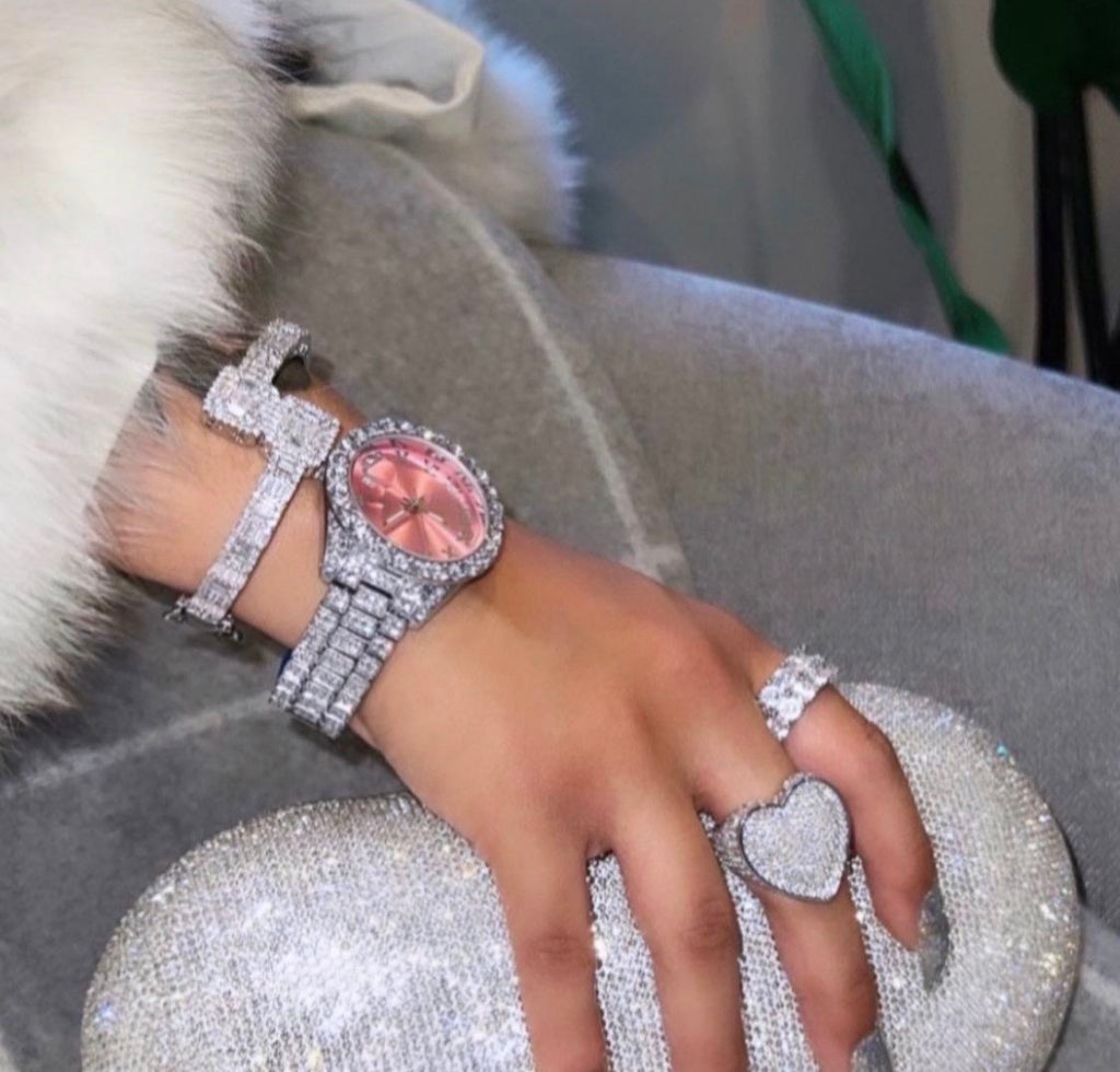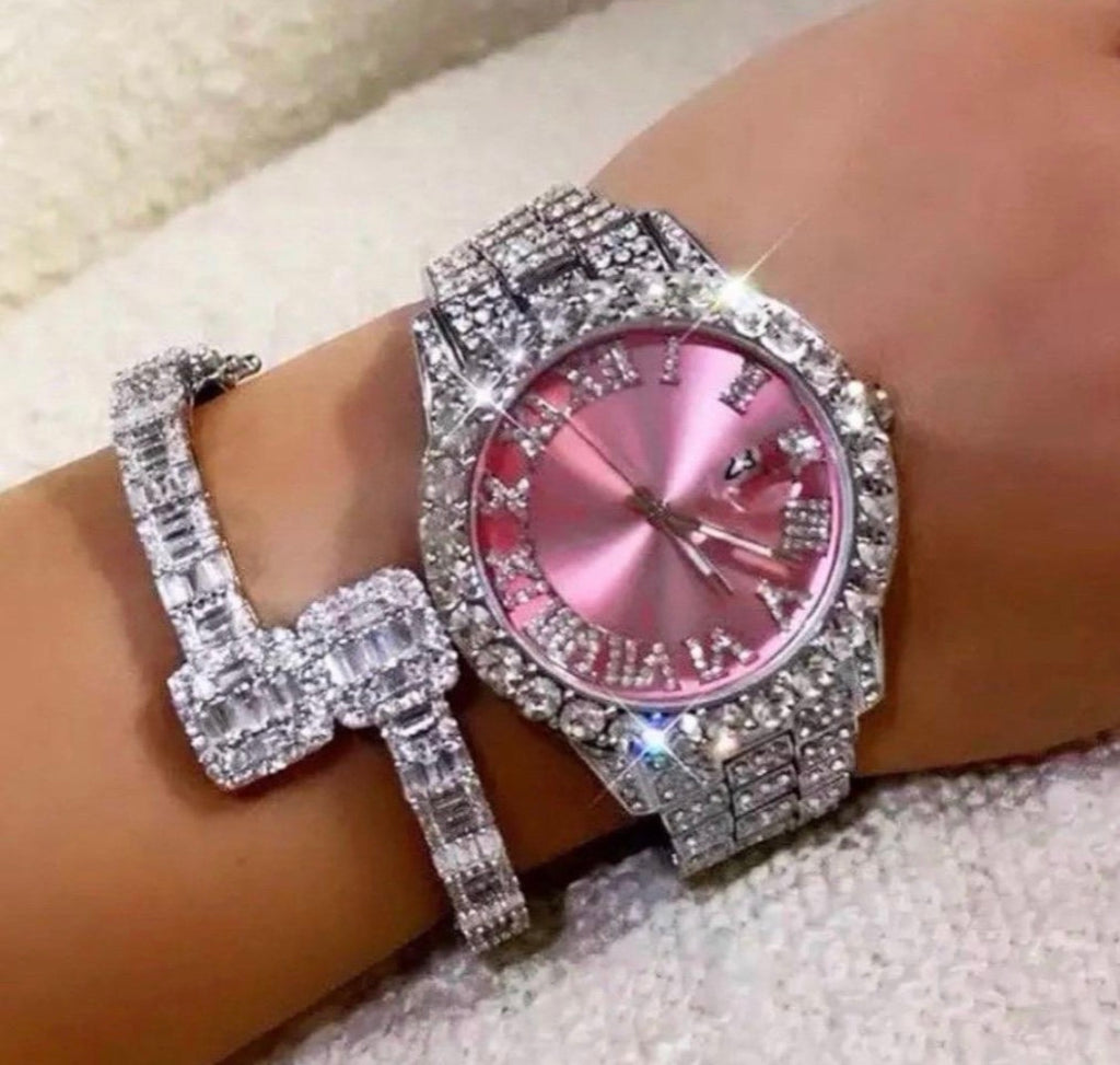 2 piece SET ! Pink and silver watch and square baguette bracelet