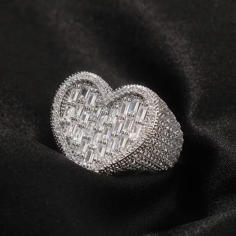 Heart ring ,heart CZ Ring , luxury ring , Full Cubic Zircon Paved Copper Big Heart Ring Iced Out Bling Hip Hop Fashion
