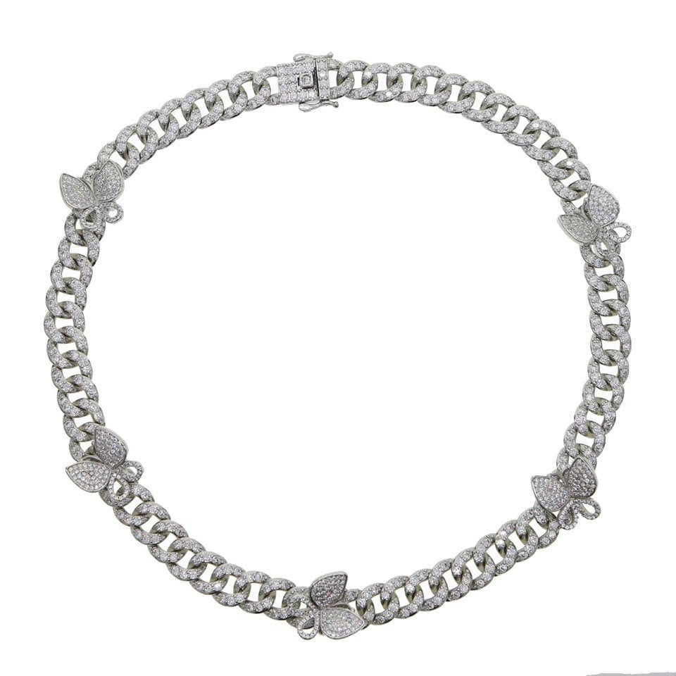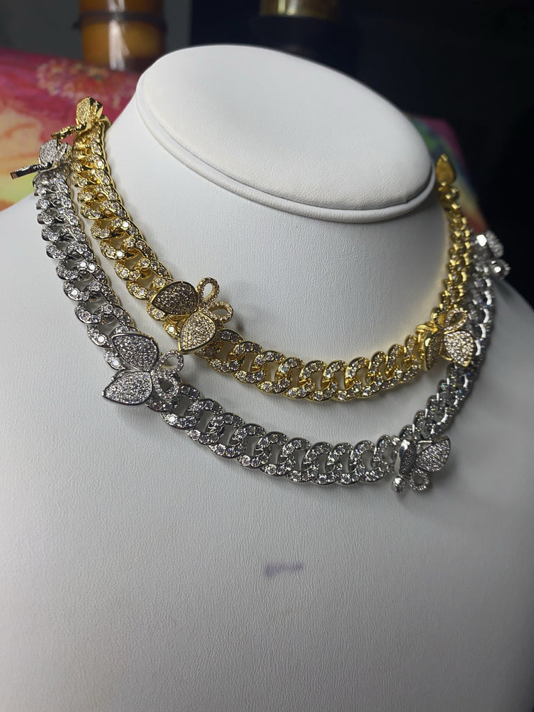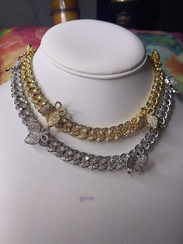 2 piece SET GOLD and SILVER butterfly cuban choker , cz cuban butterfly necklace ,cuban bling iced butterfly, butterfly pendant necklace